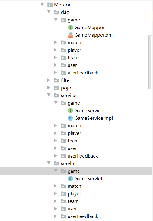 上图为博主在数据库课设中项目的文件结构。dao->service->servlet。其中 dao 层和 service 层有对应的接口和实现。